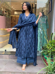 Women Cotton Ikkat Blue Kurta Pant and Dupatta set